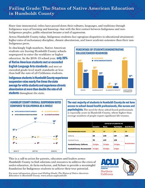Today, the ACLU Foundation of Northern of California released Failing Grade: The Status of Native American Education in Humboldt County, a report revealing vast and troubling disparities in education outcomes for Indigenous students in Humboldt County. The report exposes a system that fails Native American students by not providing the skills they need to succeed in school and the workforce.